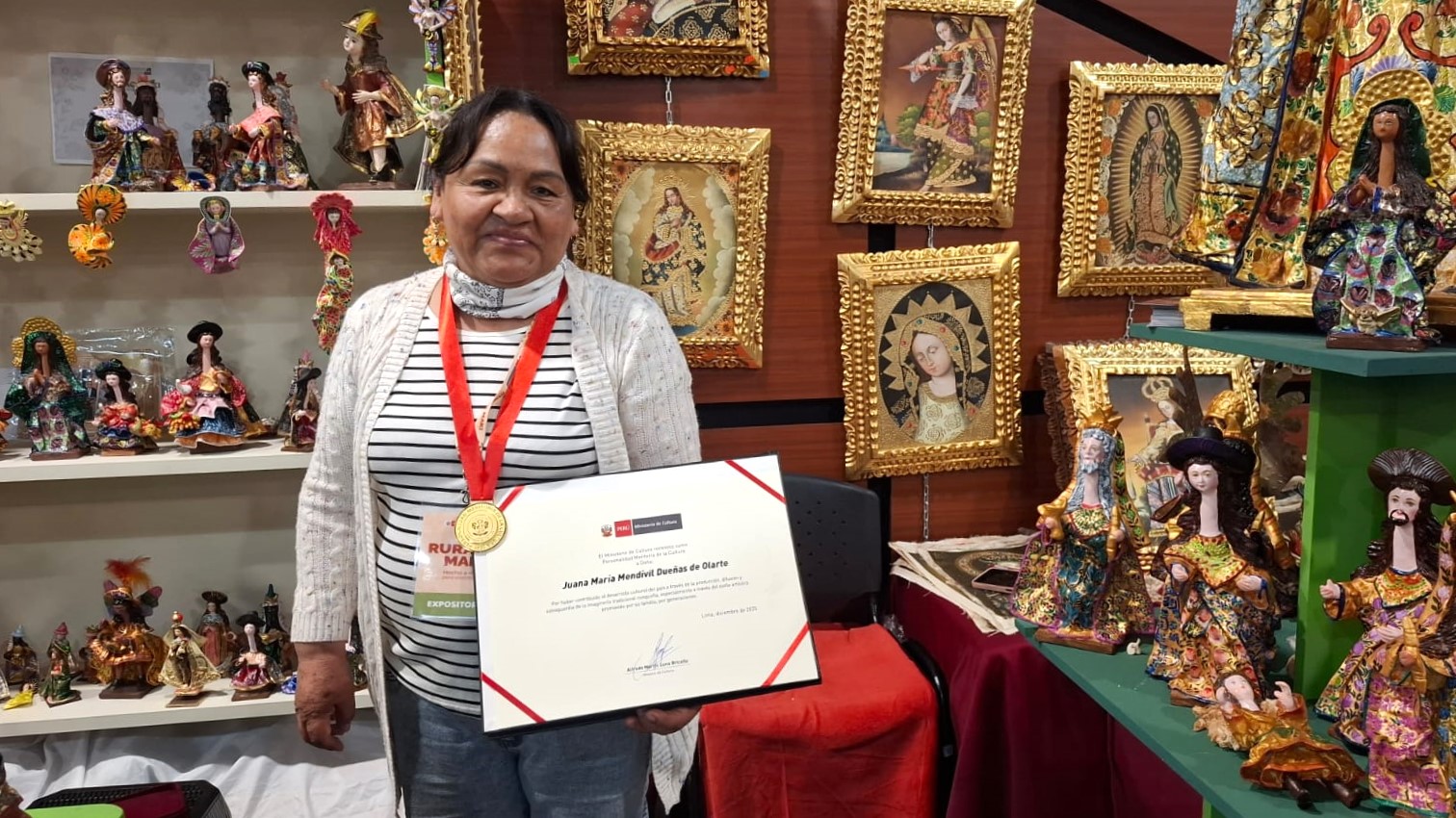 Pero, esta tarde, su rostro tiene un brillo especial cuando nos muestra el diploma y la medalla que recibió el último 4 de diciembre al ser distinguida como Personalidad Meritoria de la Cultura, “por haber contribuido al desarrollo cultural del país a través de la producción, difusión y salvaguardia de la imaginería tradicional cusqueña, especialmente a través del estilo artístico promovido por su familia, por generaciones”.